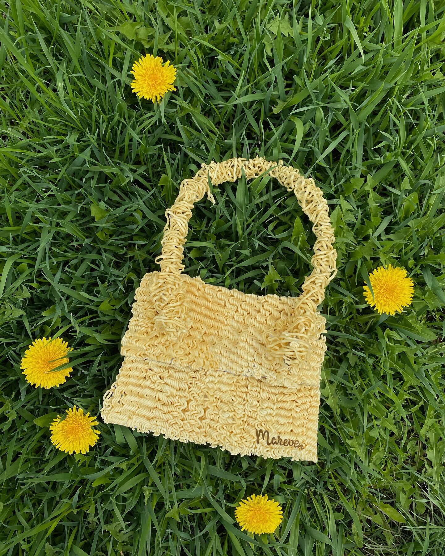 A bag crafted from Brussels sprouts and other garden materials.